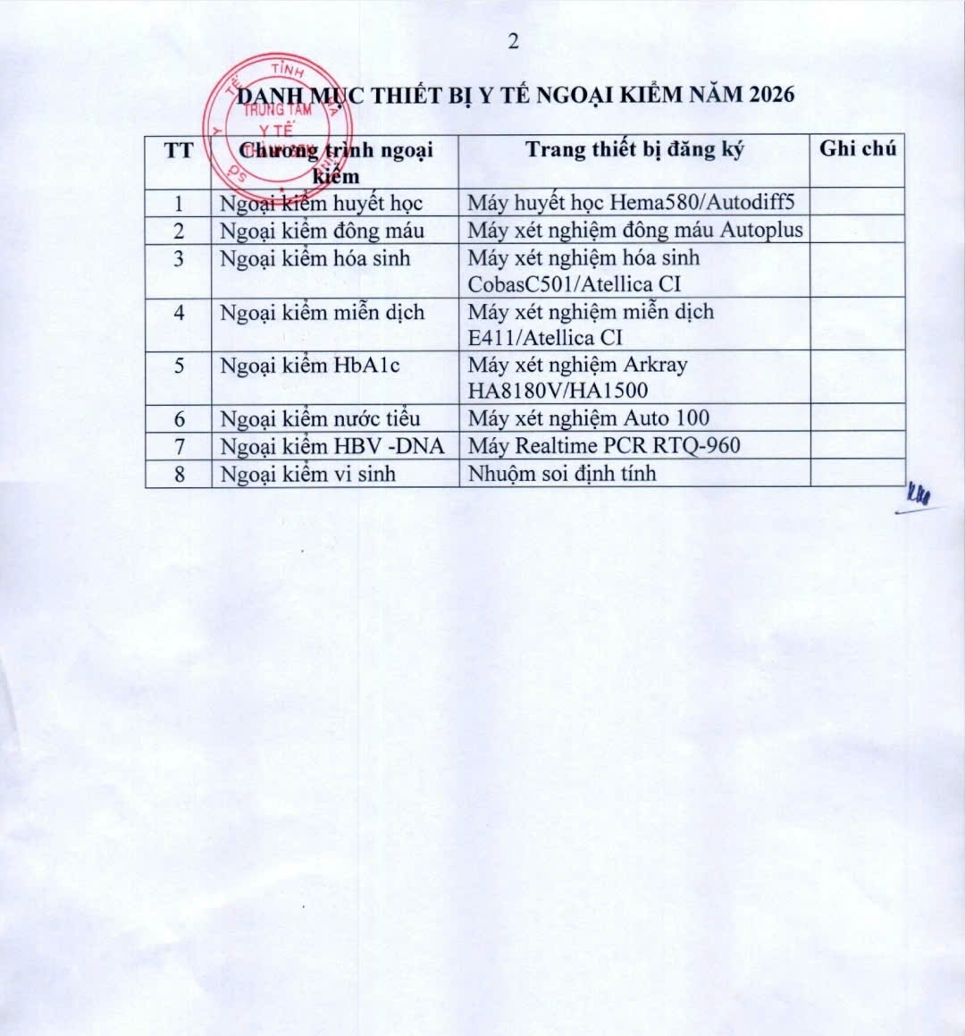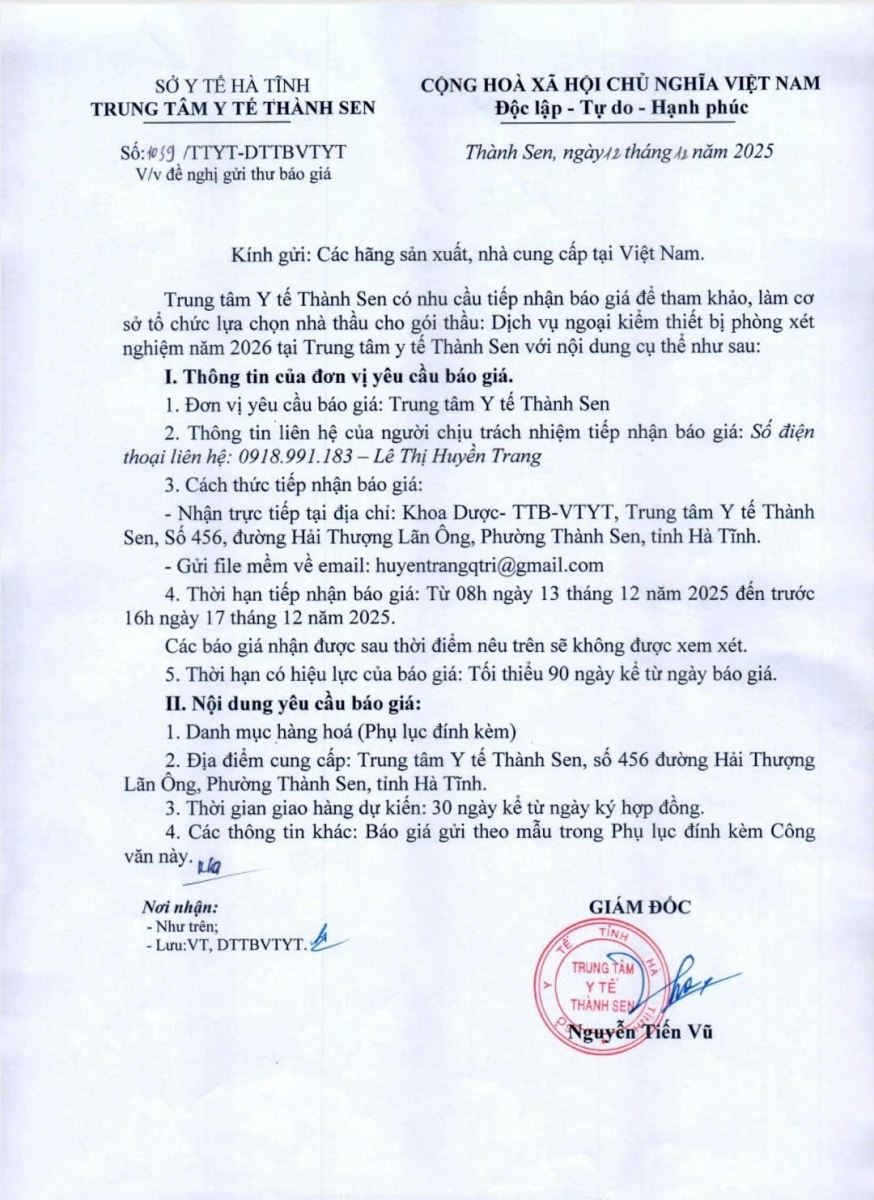 Đề nghị gửi thư báo giá số 1039 về lựa chọn nhà thầu cho gói: Dịch vụ ngoại kiểm phòng xét nghiệm 2026 tại Trung tâm y tế Thành Sen.
